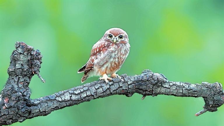我近距離地看著這小小的、聰慧的鳥兒。它的上體是棕黃色的,散布著許多白點(diǎn),頭上的白點(diǎn)比身上的更加細(xì)密。貓頭鷹脖子的轉(zhuǎn)動(dòng)極限大約是270度,能水平轉(zhuǎn),也能上下轉(zhuǎn),這個(gè)“超能力”讓眼前的小家伙能更靈活機(jī)敏地打量我。它的眼周有一圈兒顯眼的白色,于喙的上方幾乎相連,變成兩道白色的眉毛,平添了幾分威武。