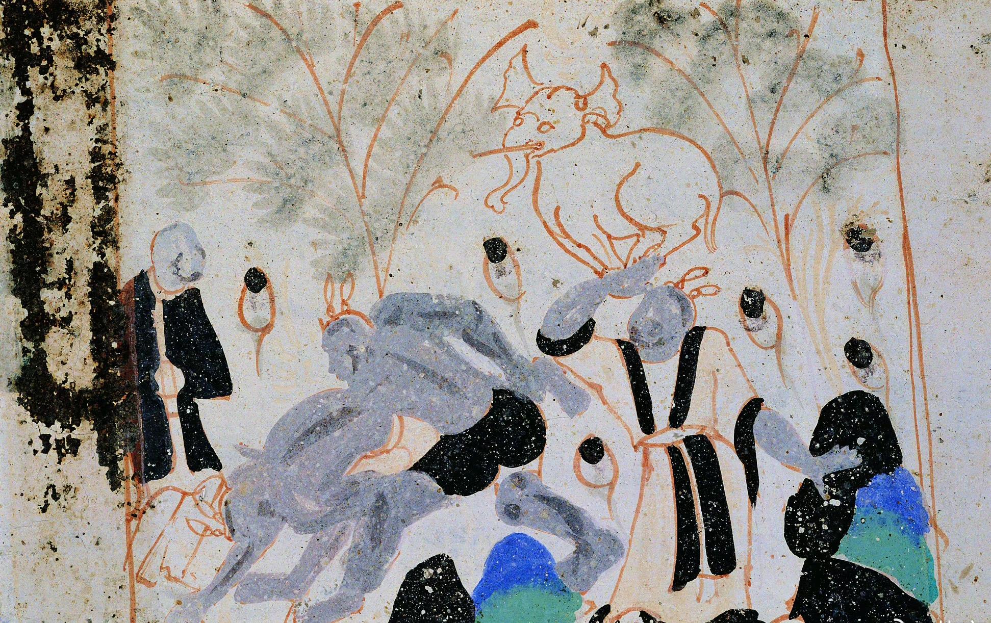 摔跤:古代運(yùn)動(dòng)中,摔跤就一直是主要的比賽項(xiàng)目之一。莫高窟第290窟中就描繪了一場(chǎng)緊張的摔跤比賽,畫(huà)面上,兩名頭扎丱角髻,下穿兜襠的對(duì)手正在一決勝負(fù),旁邊還繪有裁判。這幅千年前的畫(huà)面將摔跤、相撲比賽中講求技巧和戰(zhàn)術(shù)形象地表現(xiàn)了出來(lái)。莫高窟第290窟,北周。