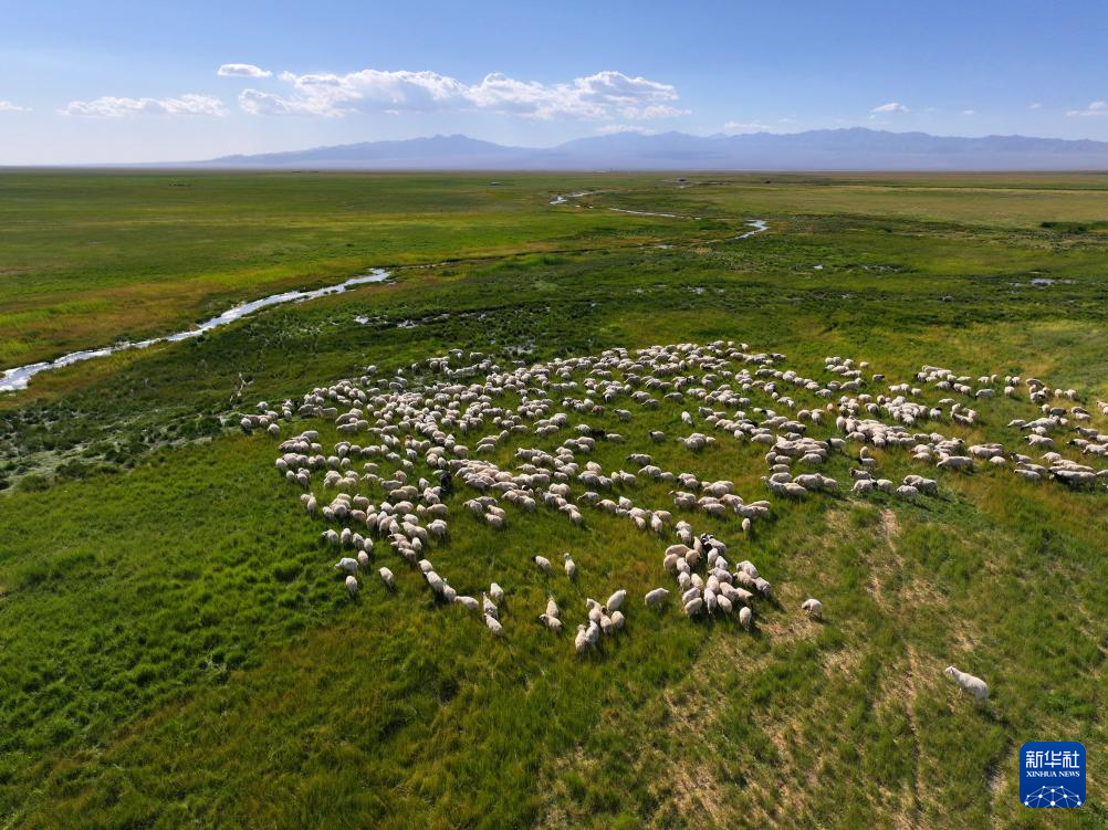 7月30日,羊群在小蘇干湖濕地覓食(無人機照片)。新華社發(fā)(高宏善 攝)