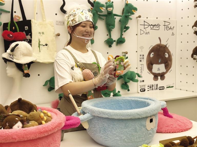 在甘肅省博物館藝術(shù)生活館的購物專區(qū),各種食材被做成了毛絨玩具,統(tǒng)一放進(jìn)加大號(hào)的毛絨砂鍋,顧客還可以根據(jù)口味“私人訂制”,最后得到一把全食材版的玩具花束。不少網(wǎng)友看過視頻后,留言“很符合年輕人的‘口味’。”