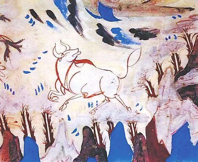 在莫高窟第454窟壁畫(huà)中有一幅“耕牛圖”:畫(huà)面刻畫(huà)了一頭正在勞作的耕牛。畫(huà)師用土黃色作為畫(huà)面的主色調(diào),將正在馭牛的人只是寥寥數(shù)筆勾勒其形體而已,卻用了醒目的赭紅色來(lái)表現(xiàn)一頭牛正在使盡全身力氣耕耘的形象。透過(guò)畫(huà)面我們能感知到這是一頭“不待揚(yáng)鞭自?shī)^蹄”的老黃牛。除了描繪在農(nóng)耕生活中勤勤懇懇的耕牛,敦煌壁畫(huà)中還描繪了其他形形色色的牛。在莫高窟第249窟壁畫(huà)中有一幅“受驚的野牛圖”,畫(huà)面上刻畫(huà)了一群在山林間閑庭信步的野牛,它們神色安詳自若。忽然一只矯健的猛獸疾馳而至,其中一頭牛受驚回首。這些均被技藝精湛的畫(huà)師惟妙惟肖生動(dòng)勾勒而出。我們看到一只肌肉健碩、神態(tài)生動(dòng)的野牛幾乎要從壁畫(huà)中呼之欲出,令人唯恐避之不及。還有在莫高窟第61窟壁畫(huà)中有一幅“金牛宮圖”,這是“黃道十二宮”中的其中一幅圖。所謂的“黃道十二宮”就是今天所說(shuō)的十二星座,畫(huà)面中的金牛體態(tài)豐滿(mǎn),神態(tài)安詳,牛的敦厚忠誠(chéng)、樸實(shí)溫馴、勤勉勞作、默默無(wú)聞的精神贏得了人們的信任。