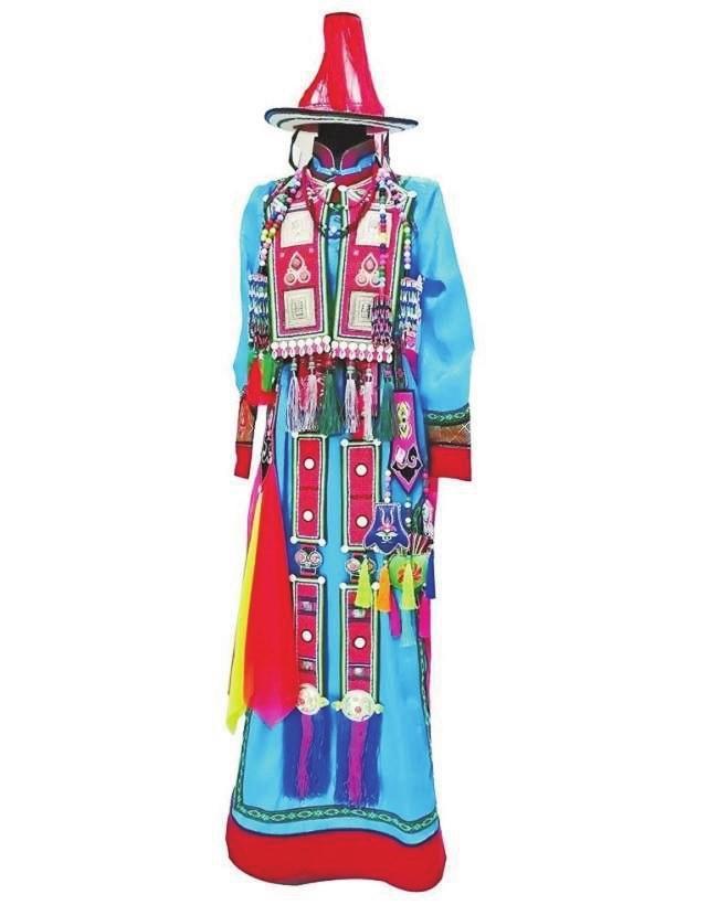 女性婚服是最隆重的,很多婚后日常服裝也在此時(shí)備好。女性婚服中最具辨識(shí)度的是頭面,長(zhǎng)條形頭面佩戴在女子的三條長(zhǎng)辮子上,胸前兩條,背后一條。多見(jiàn)布制的頭面,綴上珊瑚、綠松石、瑪瑙等,也有用紅牛皮底、黑或紅色絲絨底的頭面,鑲上銀牌、蜜蠟、珊瑚、松石等飾物,背后的一條頭面下方垂一顆紅珊瑚,上面鑲23塊白色海螺磨制的圓片,這種傳統(tǒng)頭面總重量約在五到七斤左右。傳統(tǒng)女性婚服多用藍(lán)色和綠色,以區(qū)別于著紅色服裝的“點(diǎn)格爾汗”天神。隨著文化的交流變化,對(duì)服裝色彩的禁忌逐漸消解,黃色、米黃色、紅色等色彩也常被新娘穿戴。