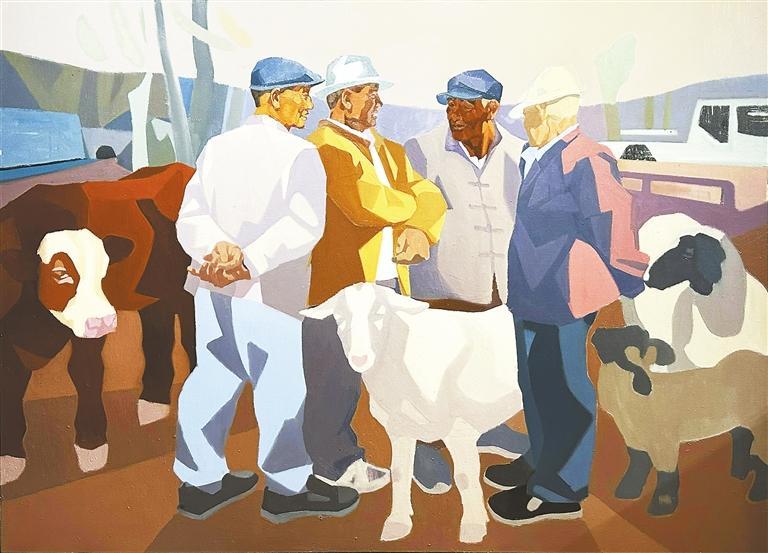 《和風(fēng)》系列作品取材于禮縣鹽官鎮(zhèn)騾馬市場(chǎng)逢集時(shí)交易的場(chǎng)景。幼時(shí),我經(jīng)常隨父親去鹽官騾馬市場(chǎng)趕集,對(duì)這個(gè)場(chǎng)景熟悉且親切。也正因?yàn)槿绱耍覍?duì)這個(gè)題材有著難以割舍的情愫,總是忍不住想通過畫筆呈現(xiàn)這一記憶。