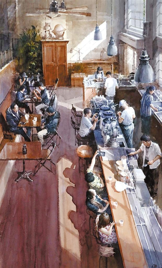 《網(wǎng)紅咖啡館的午后》用寫實(shí)方法展現(xiàn)了一個(gè)溫馨的生活場(chǎng)景。在構(gòu)圖上,以俯視的角度用大場(chǎng)景來做整體畫面的籌劃,在整體色調(diào)上以沉穩(wěn)厚重的暖色作為基調(diào),把光線穿插、引入到畫面中。在布局上,以陽光照耀下的咖啡館吧臺(tái)為主要表現(xiàn)組群,分別刻畫、塑造了工作中的前臺(tái)人員、打卡拍照的女性顧客群;把暗部區(qū)域,幾組在咖啡桌邊交談、用餐、喝咖啡的顧客群作為第二層次,展現(xiàn)他們不同的神情和體態(tài);然后完善整體的空間感。在用筆上盡量以松動(dòng)的筆觸,又能展現(xiàn)細(xì)節(jié)的方式來塑造,利用水彩畫需要干、濕、松、緊相結(jié)合,多層次、多遍數(shù)進(jìn)行渲染的特性,盡可能達(dá)到預(yù)期效果。 (本版文圖由甘肅省美術(shù)家協(xié)會(huì)提供)