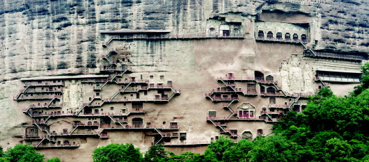 麥積山石窟與敦煌莫高窟、大同云岡石窟、洛陽龍門石窟齊名,是中國四大石窟之一,被譽為“東方雕塑陳列館”。公元759年杜甫流寓天水,作《山寺》詩:“野寺殘僧少,山園細路高。麝香眠石竹,鸚鵡啄金桃。亂石通人過,懸崖置屋牢。上方重閣晚,百里見秋毫。”其自然景觀與人文景觀完美結(jié)合,是世界文化遺產(chǎn)、全國重點文物保護單位,也是中原北方地區(qū)最早的皇家石窟,洞窟內(nèi)還保存了中國最早的連環(huán)畫作品。