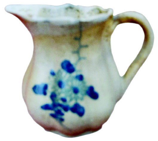該口杯高10cm,上口手捏黏泥接連,珍珠釉澆注粘連處留有數(shù)滴珍珠釉淚珠??谘厍皟A,連口粘痕明顯裸露。通體呈吊南瓜分棱,八道指泥壕顯八股棱條。造型珍瓏靈秀,珍貴之處在于上施淺瑪瑙釉,體面使用藍(lán)寶石礦料畫一束盛開的菊花。畫筆嫻熟簡(jiǎn)練,富有立體感,且活靈活現(xiàn)。在背面腰中部,用淡青花題“□□”二字,字雖模糊不清,但胎土細(xì)膩,瓷壁輕薄又堅(jiān)硬如骨,胎底色黃中泛紅,瓷體表面青釉中又泛小針褐色點(diǎn)。把手處,窯變?yōu)轵球咀吣嗉y。這種泥紋,沉重古樸,明亮而深沉,是釉層在干燥或燒成時(shí)發(fā)生干裂,后在高溫階段又有釉流入填補(bǔ)而形成的。在民國(guó)以前,蚯蚓紋曾被作為判斷鈞釉的唯一標(biāo)準(zhǔn)。