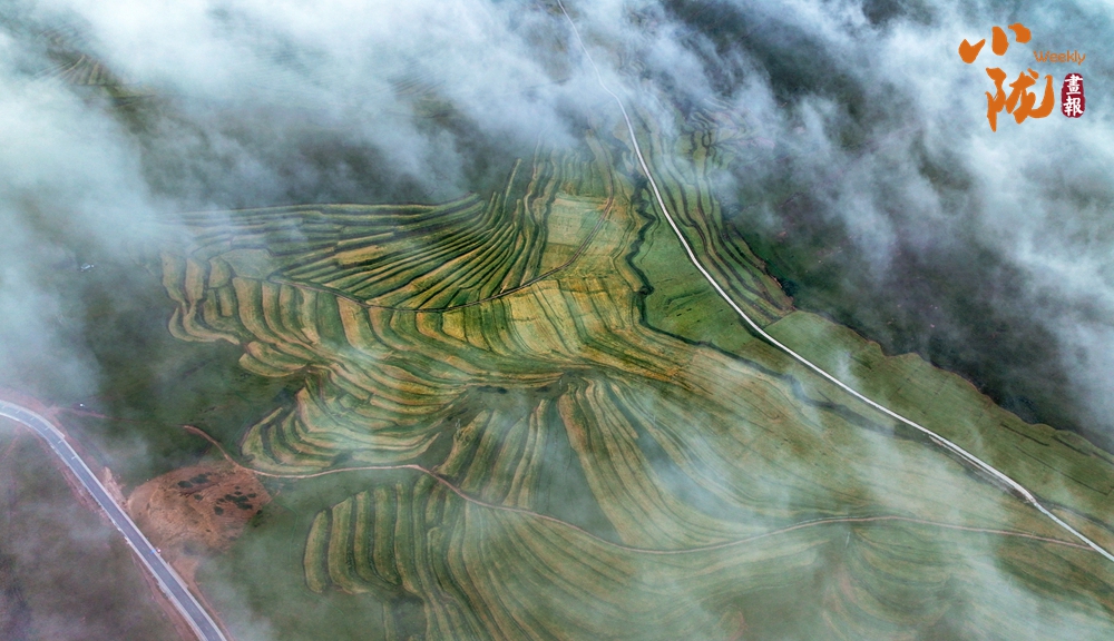 一場秋雨過后,甘南臨潭連綿的群山被云霧籠罩,星羅棋布的梯田上迎來收獲期,稻浪滾滾,美不勝收。
