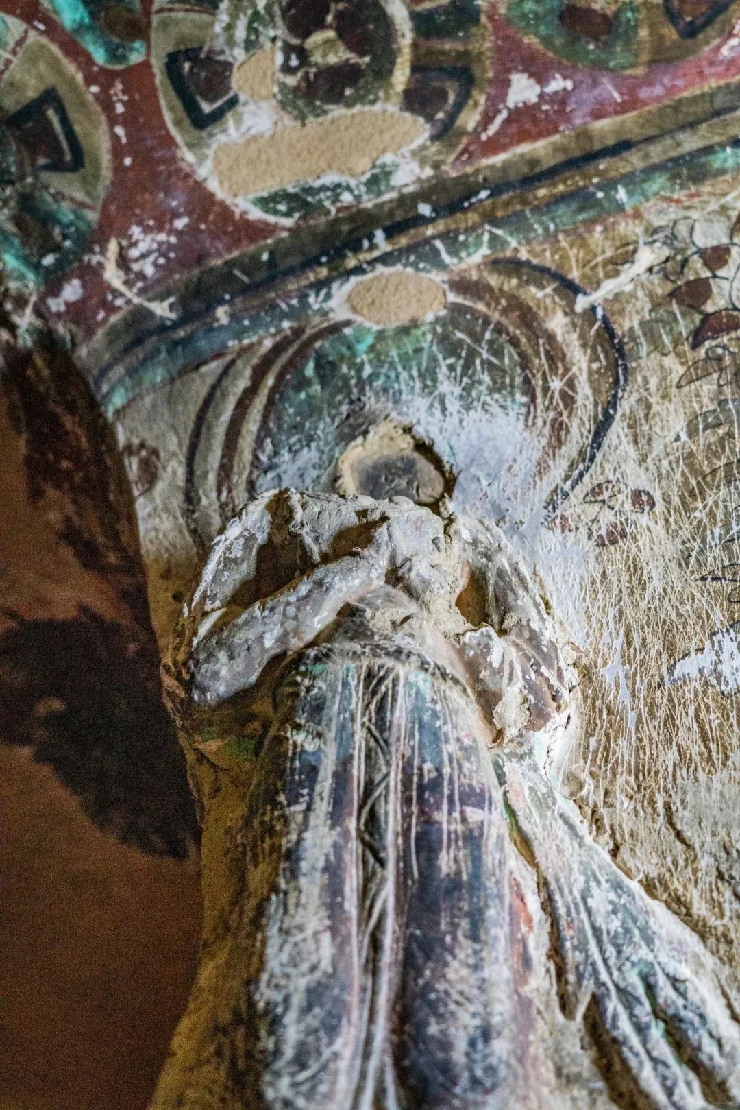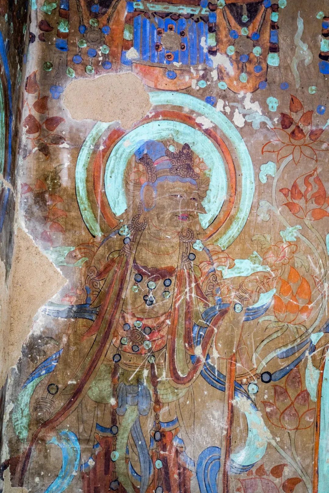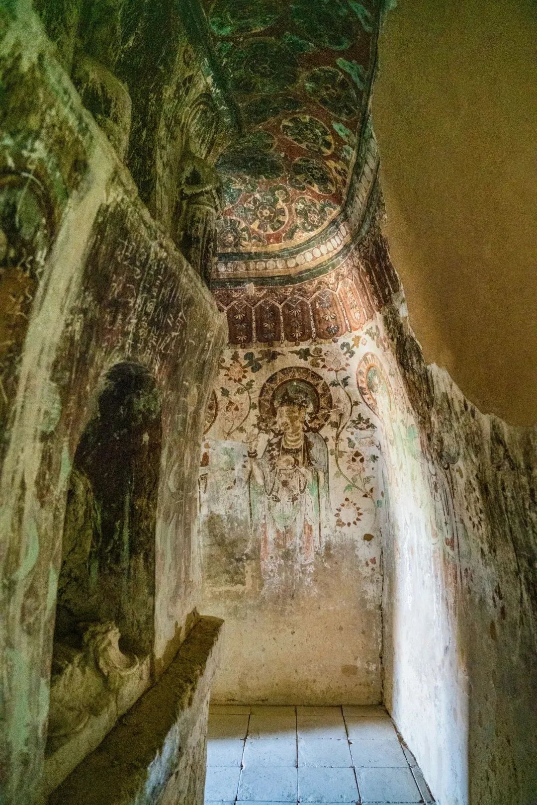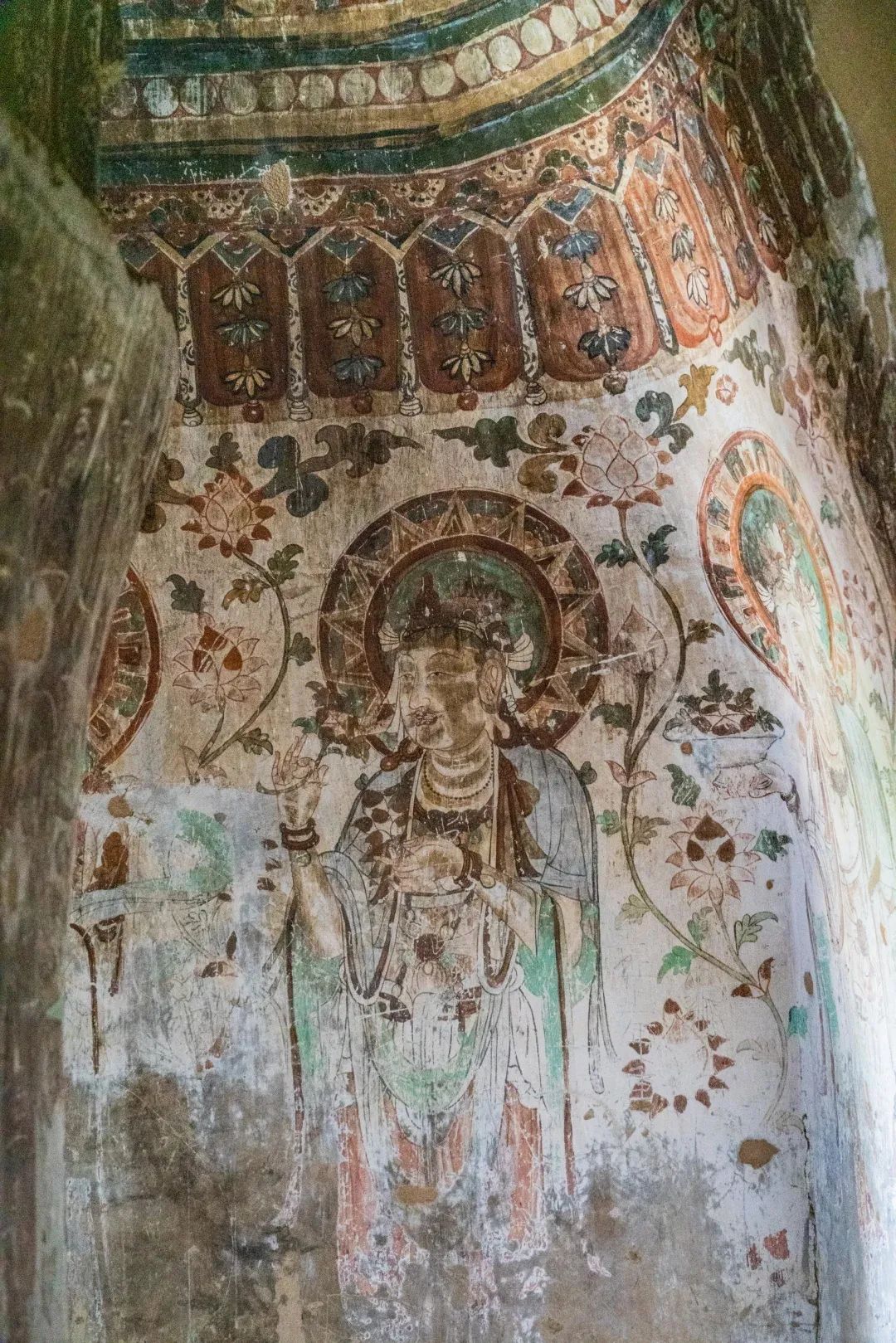 昌馬石窟第4窟洞窟形制及其殘存的塑像對(duì)于研究中國(guó)早期石窟藝術(shù)與佛教造像藝術(shù)極其重要??邇?nèi)壁畫(huà)內(nèi)容是四壁上方畫(huà)條式旌幡,下畫(huà)供養(yǎng)菩薩,身高近2米,今殘存20身,菩薩周?chē)?huà)纏枝蓮,與第二窟基本相同??唔斍鞍氩康卣檀蟛糠置撀?,靠近中心柱正面上部右側(cè)的部位殘存龜形六瓣團(tuán)花圖案與一身飛天及菊花紋圖案。后部中心柱頂部周?chē)唔敱砻胬L龜形六瓣團(tuán)花、連珠紋等圖案。