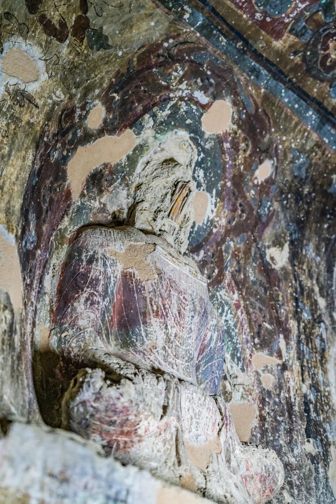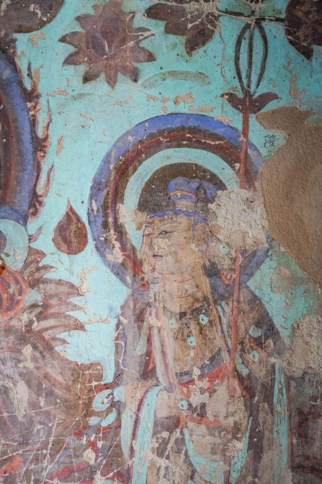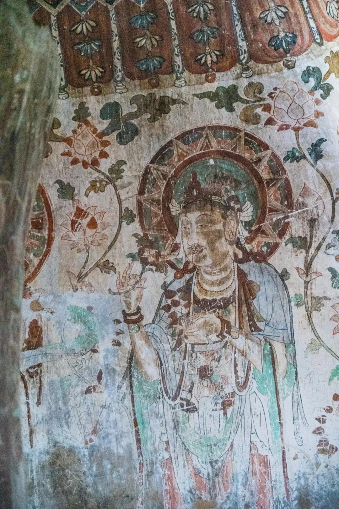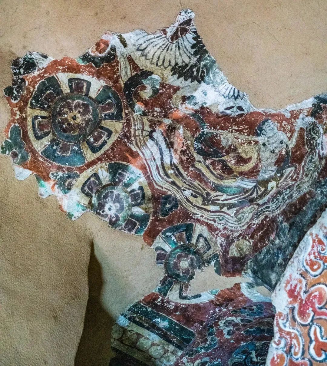 昌馬石窟第4窟洞窟形制及其殘存的塑像對(duì)于研究中國(guó)早期石窟藝術(shù)與佛教造像藝術(shù)極其重要??邇?nèi)壁畫(huà)內(nèi)容是四壁上方畫(huà)條式旌幡,下畫(huà)供養(yǎng)菩薩,身高近2米,今殘存20身,菩薩周?chē)?huà)纏枝蓮,與第二窟基本相同??唔斍鞍氩康卣檀蟛糠置撀?,靠近中心柱正面上部右側(cè)的部位殘存龜形六瓣團(tuán)花圖案與一身飛天及菊花紋圖案。后部中心柱頂部周?chē)唔敱砻胬L龜形六瓣團(tuán)花、連珠紋等圖案。