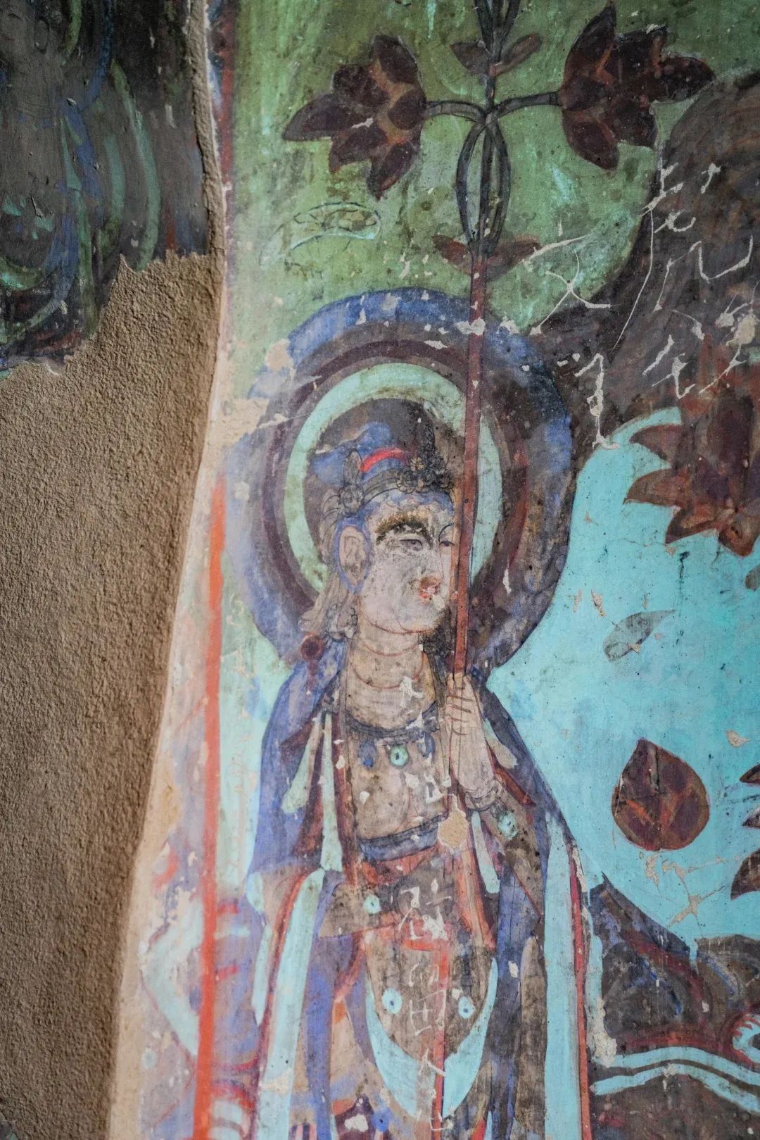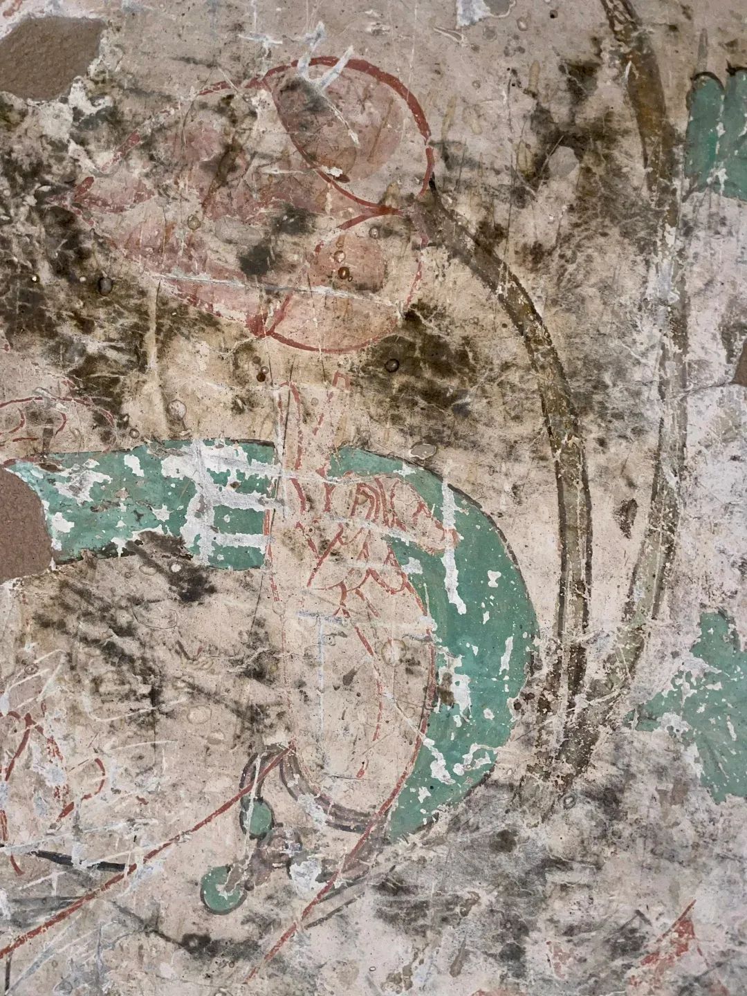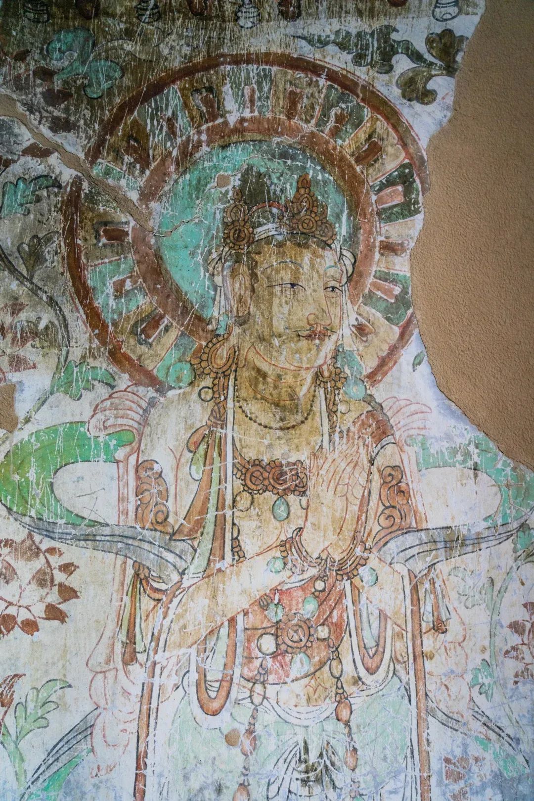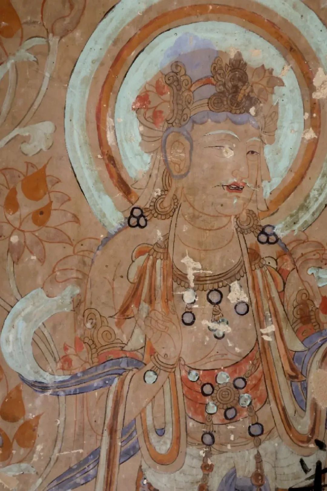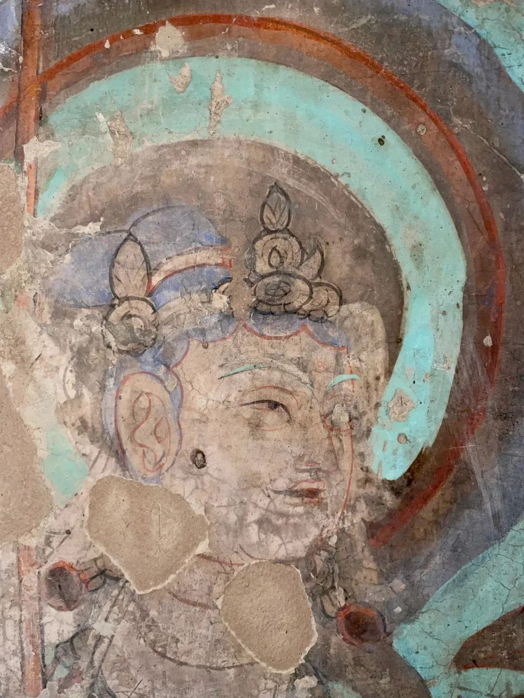 昌馬石窟第4窟洞窟形制及其殘存的塑像對(duì)于研究中國(guó)早期石窟藝術(shù)與佛教造像藝術(shù)極其重要??邇?nèi)壁畫(huà)內(nèi)容是四壁上方畫(huà)條式旌幡,下畫(huà)供養(yǎng)菩薩,身高近2米,今殘存20身,菩薩周?chē)?huà)纏枝蓮,與第二窟基本相同??唔斍鞍氩康卣檀蟛糠置撀?,靠近中心柱正面上部右側(cè)的部位殘存龜形六瓣團(tuán)花圖案與一身飛天及菊花紋圖案。后部中心柱頂部周?chē)唔敱砻胬L龜形六瓣團(tuán)花、連珠紋等圖案。