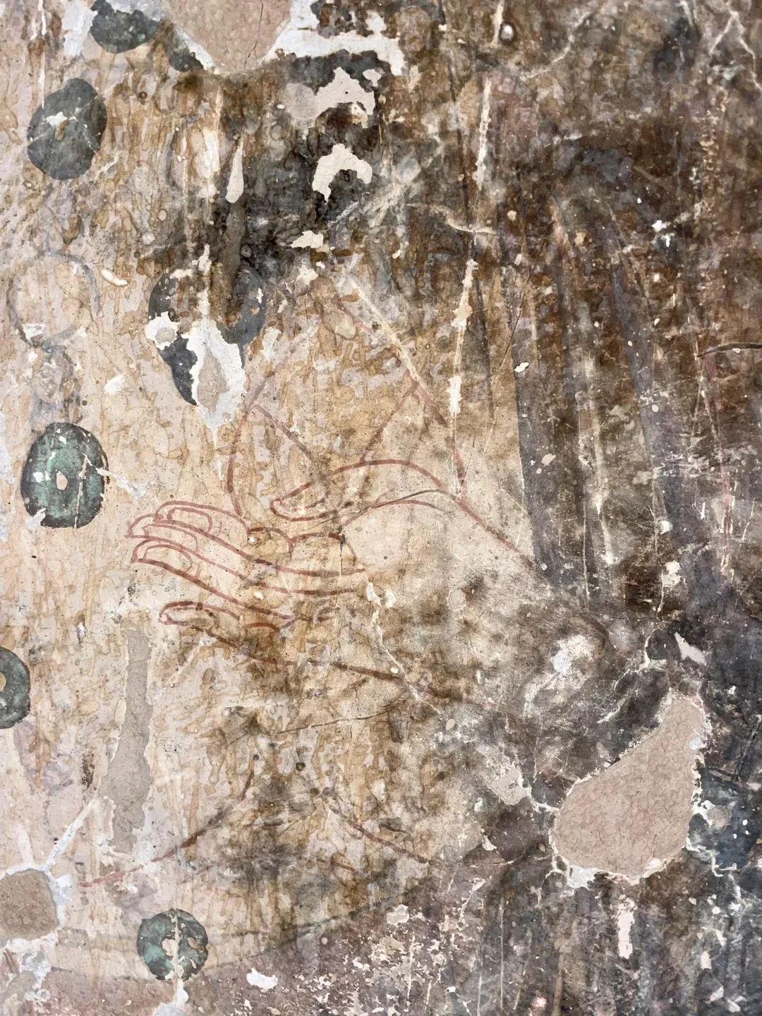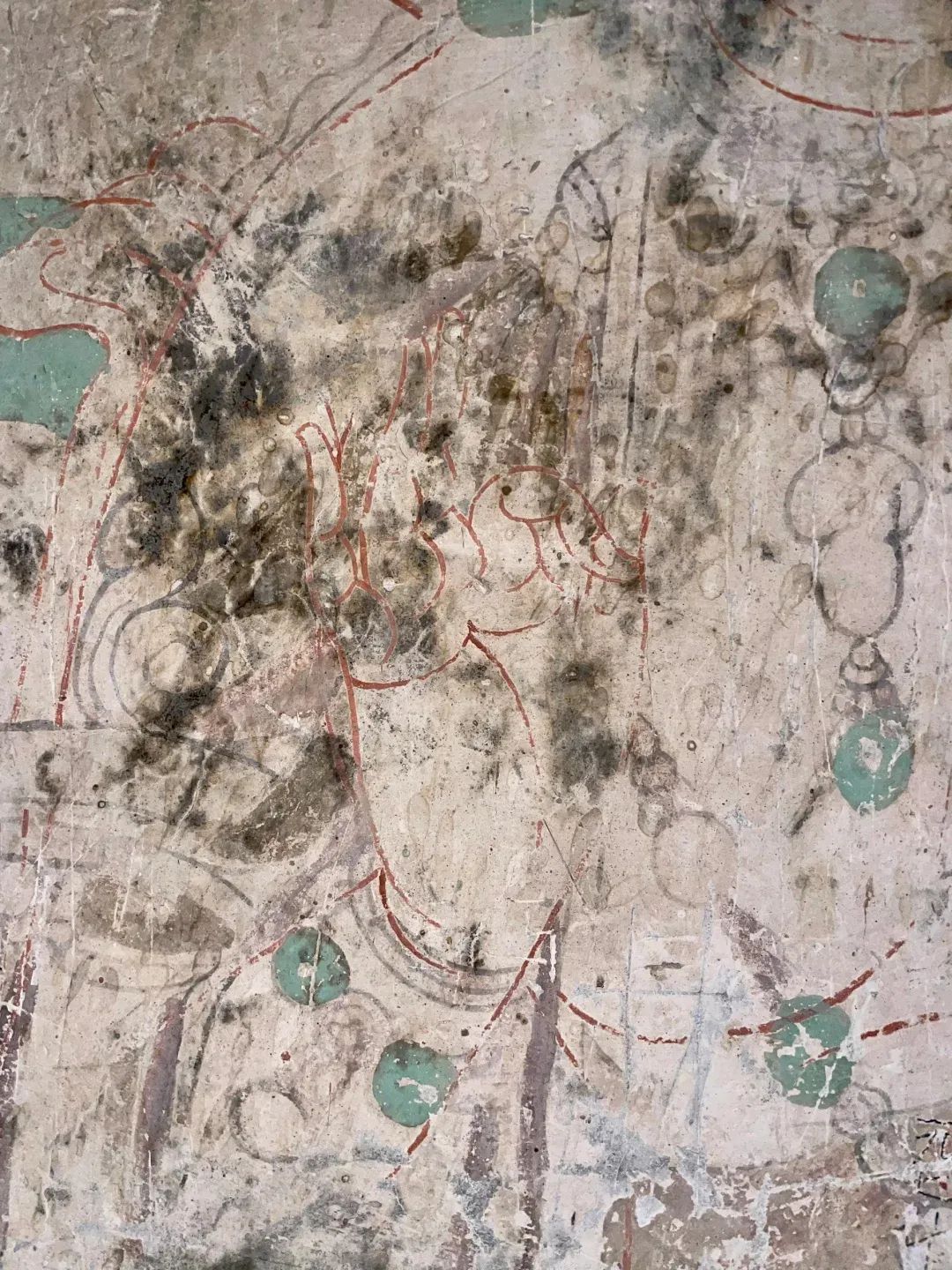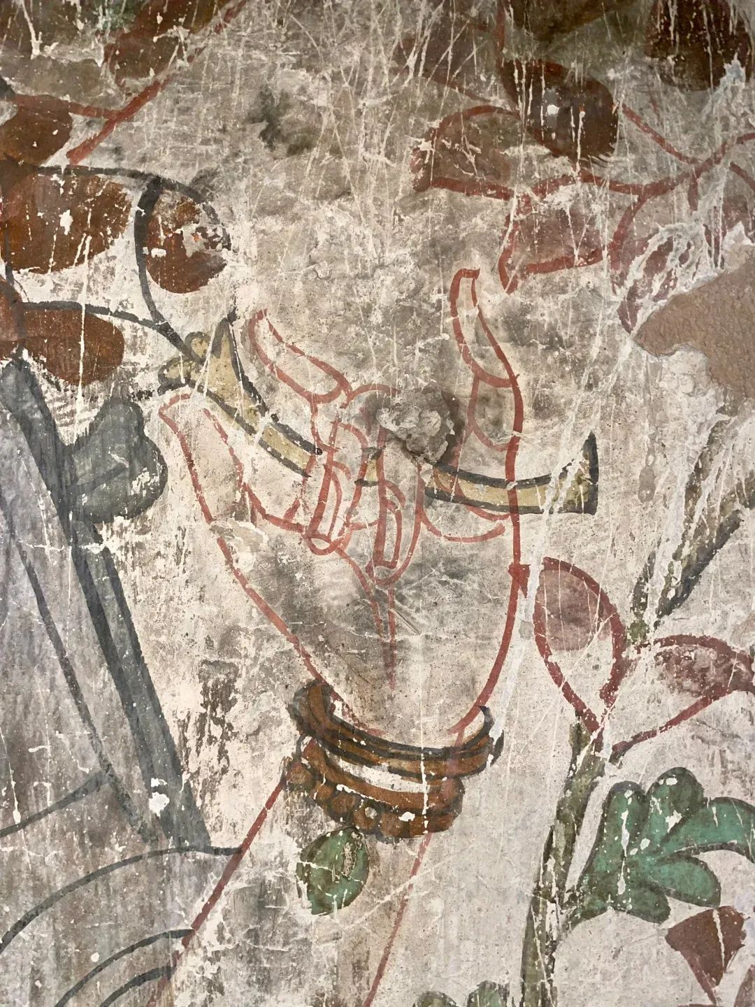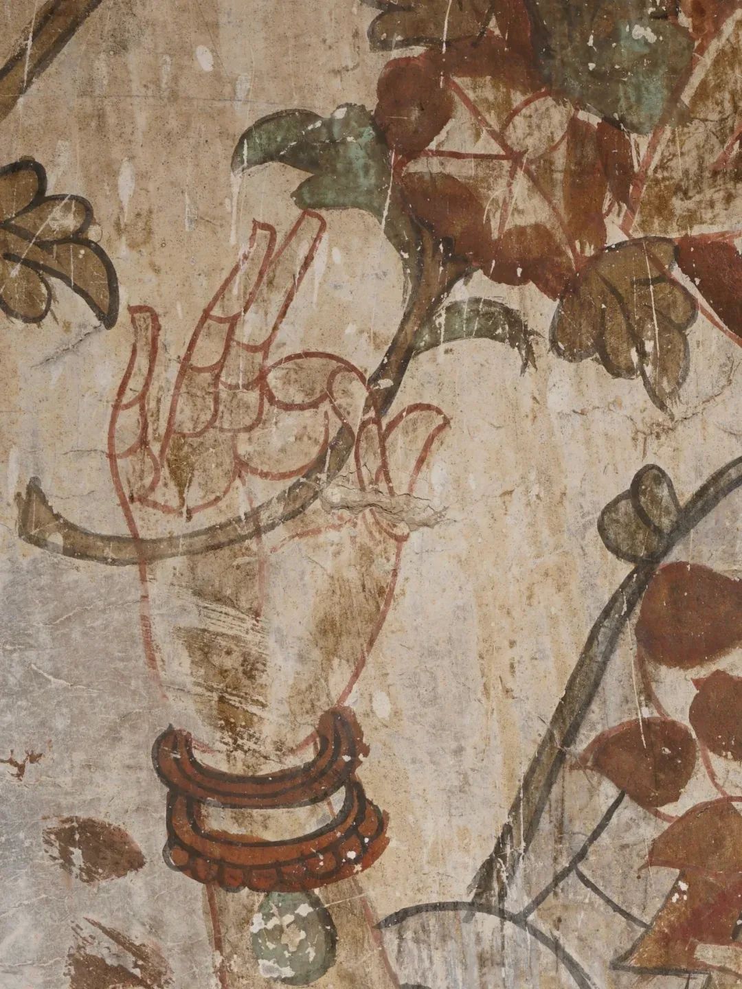 昌馬石窟第4窟洞窟形制及其殘存的塑像對(duì)于研究中國(guó)早期石窟藝術(shù)與佛教造像藝術(shù)極其重要??邇?nèi)壁畫(huà)內(nèi)容是四壁上方畫(huà)條式旌幡,下畫(huà)供養(yǎng)菩薩,身高近2米,今殘存20身,菩薩周?chē)?huà)纏枝蓮,與第二窟基本相同??唔斍鞍氩康卣檀蟛糠置撀?,靠近中心柱正面上部右側(cè)的部位殘存龜形六瓣團(tuán)花圖案與一身飛天及菊花紋圖案。后部中心柱頂部周?chē)唔敱砻胬L龜形六瓣團(tuán)花、連珠紋等圖案。