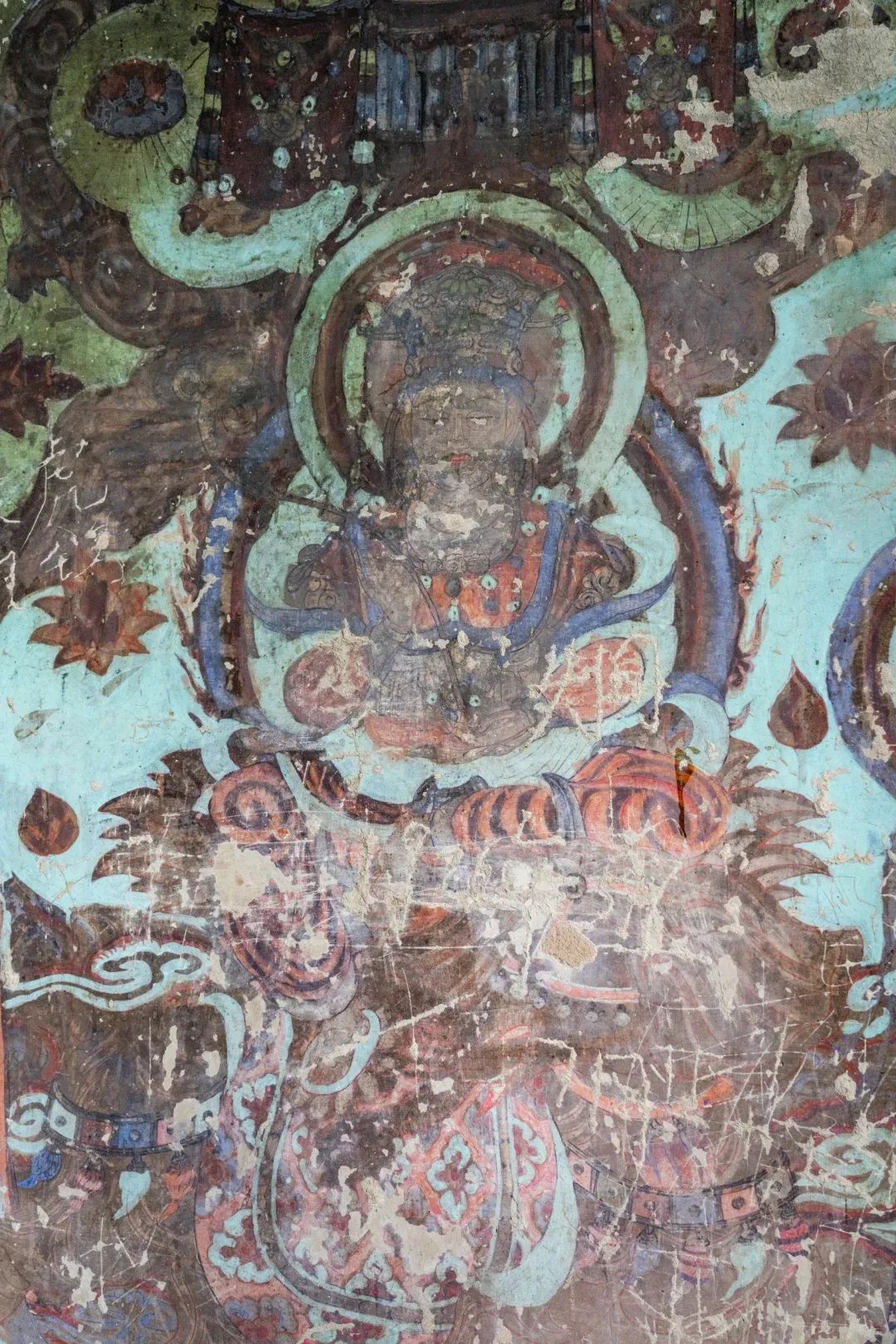 現(xiàn)在第4窟中早期塑像多數(shù)已毀,但仍殘存少數(shù)幾身,十分珍貴;各側(cè)面表層為西夏重修時(shí)繪制的壁畫(huà);柱座與柱身的兩層自下而上逐層縮小;中心柱正面在西夏時(shí)改造成一橢圓形的大背屏,背屏正面表層為清代重繪的壁畫(huà);四壁及頂上壁畫(huà)也多為西夏時(shí)期。
