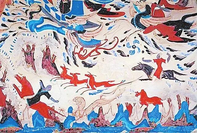 在莫高窟第249窟壁畫中有一幅“行獵圖”:畫面上都是些體型巨大的動(dòng)物,有體態(tài)矯健的猛虎、疾馳俊逸的鹿群、整裝待發(fā)的獅子等,有在奔馳的駿馬上拈弓搭箭窮追不舍的獵人,還有在飛奔的駿馬上淡定轉(zhuǎn)身從容射虎的獵人。整個(gè)畫面既緊張又美好,使人不由得對畫師精湛的技藝心悅誠服。唐代詩人王維在詩作《觀獵》中寫道:“風(fēng)勁角弓鳴,將軍獵渭城。草枯鷹眼疾,雪盡馬蹄輕。忽過新豐市,還歸細(xì)柳營?;乜瓷涞裉帲Ю锬涸破?。”意思是說將軍的獵騎,飛馳在渭城的近郊。風(fēng)中傳來呼嘯的弦聲。已枯的野草,擋不住尖銳敏捷的鷹眼,積雪后飛馳的駿馬馬蹄會(huì)愈加輕盈。據(jù)文獻(xiàn)記載,唐宋時(shí)期人們打獵時(shí)多有一種“西北望,射天狼”的豪情!在莫高窟第85窟壁畫中還有一幅“行獵圖”就形象地反映了唐人狩獵的情景:畫面上的四個(gè)健碩獵人正在整裝出獵,他們著裝統(tǒng)一:頭戴幞頭,身穿缺胯衫,足蹬半腰靴。打獵的裝備也很不同:有人胳臂上架鷹、有人單手牽犬、有人持弓挎箭囊,甚至還有一人手持利斧。