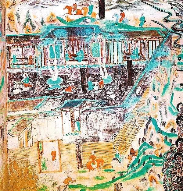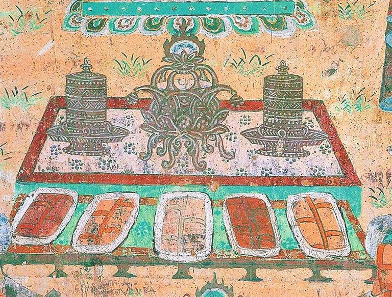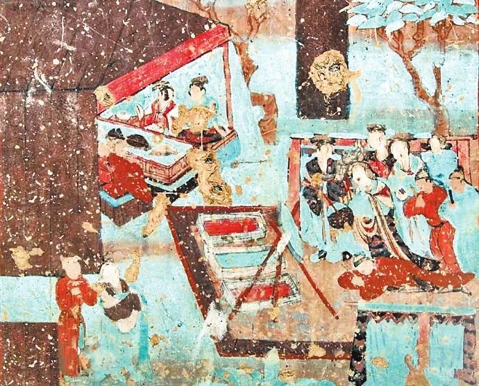 古人會(huì)在一年的歲末舉行一次集體聚會(huì),稱作“建福”。在敦煌文獻(xiàn)《社司轉(zhuǎn)帖》中寫道:“右緣常年建福一日,人各爐餅壹雙,凈粟壹斗。幸請諸公等,帖至限今月廿二日卯時(shí)于安家酒店取齊。”意思是說,只要有可能,每年到了年末大家都要選擇一日來進(jìn)行建福。每家每戶需要按時(shí)把準(zhǔn)備建福的物資送過來。唐朝詩人李白在《客中行》一詩中寫道:“蘭陵美酒郁金香,玉碗盛來琥珀光。但使主人能醉客,不知何處是他鄉(xiāng)。”意思是說蘭陵美酒甘醇甜美,就像郁金香一樣芬芳四溢。興來盛滿玉碗,泛出琥珀光晶瑩迷人。主人端出如此好酒,定能醉倒他鄉(xiāng)之客。飲酒之后哪能分清故鄉(xiāng)與他鄉(xiāng)呢?歲暮聚飲蘊(yùn)含有辭舊迎新、攘兇納吉的美好愿望。在莫高窟第12窟壁畫中有一幅“帳篷酒肆圖”:畫面中圍坐在條形長桌兩邊正盡興暢飲的客人為七人,還有兩個(gè)熱情忙碌的服務(wù)人員。整個(gè)畫面是一幅酒酣耳熱、興致高昂的歡飲圖。更為氣勢恢宏、熱鬧非凡的是莫高窟第23窟壁畫中一幅“院落圖”:畫面中分院落之內(nèi)與院落之外兩個(gè)部分,院落之內(nèi)是世俗的世界,畫面上布局著鱗次櫛比的廳堂房屋,有人正在庖廚、有人正在對弈、有人正在暢聊、有人正在團(tuán)聚,也有人正在說教,總之表現(xiàn)的是我們?nèi)粘I畹陌賾B(tài)。院落之外是佛國世界,整體呈現(xiàn)出肅穆莊嚴(yán)之感。有趣的是在佛國與世俗世界中間,畫的是服飾艷麗,騎馬遠(yuǎn)行的人們。
