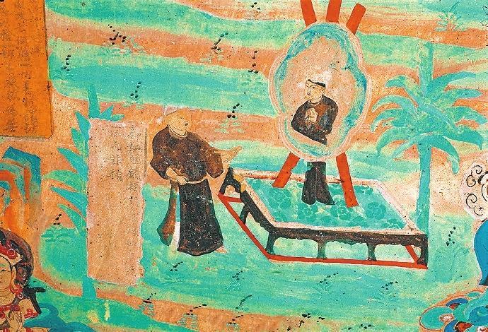 戰(zhàn)國時(shí)期楚國詩人屈原在《漁父》一文中寫道:“吾聞之,新沐者必彈冠,新浴者必振衣。安能以身之察察,受物之汶汶者乎?”意思是說我聽說剛洗過頭的人一定會(huì)去彈彈帽子上的灰塵;剛洗過澡的人一定要抖抖衣服的灰塵。怎能讓清白的身體去接觸世俗塵埃的污染呢?當(dāng)年的敦煌人走出溫泉,在身心放松之后,就該靜觀返照自己了。在莫高窟第85窟中有一幅“曲花式鏡圖”:畫面上在一個(gè)正方形鏤空的底座上擺放著一個(gè)巨大的曲花式鏡,鏡子式樣別致,明亮澄澈。藍(lán)色的曲花式樣引人矚目。但畫面上最吸睛的是一位魁梧俊朗身著一襲赭色長袍的男子,他正在鏡子前仔細(xì)地打量自己,而鏡中映射出他神情凝重的情態(tài)來。原來,古人照鏡除了正衣冠之外,還有反觀自照的含義,在鏡子前良久地注視自己,就是對自己反省、頓悟的過程。“一年好景君須記”,走過四季,到了歲末,該是每個(gè)人回望來時(shí)路,展望前方的時(shí)候了。