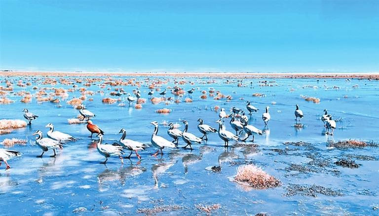 在這片濕地上,黃河的支流蜿蜒曲折,形成各式各樣的曲線。陽光下,這些彎彎曲曲的大小沼澤,猶如一條條銀色的絲帶,閃閃發(fā)光。觸手可及的藍(lán)天白云無際無涯,像洗滌過似的,亮得耀眼,牛羊滿山坡,宛如散落在人間的珍珠。這種原始的自然美景和豐富的生態(tài)資源,讓阿萬倉濕地成為一個理想的旅游目的地。