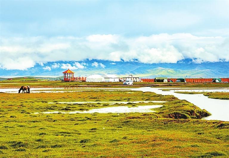 河曲馬場景區(qū)以熱爾欽濕地草原、熱爾欽湖為主要自然景觀,目前建有神駒廣場、高原馬術(shù)活動基地、步行街、親水濕地觀光平臺、星空帳篷酒店、房車帳篷營地、熱氣球觀光基地、瑪緹高端酒店等配套附屬設(shè)施。大自然在這里集高原湖濱濕地、沼澤濕地、高寒草原于一體,構(gòu)成了復(fù)合型的別樣景觀。