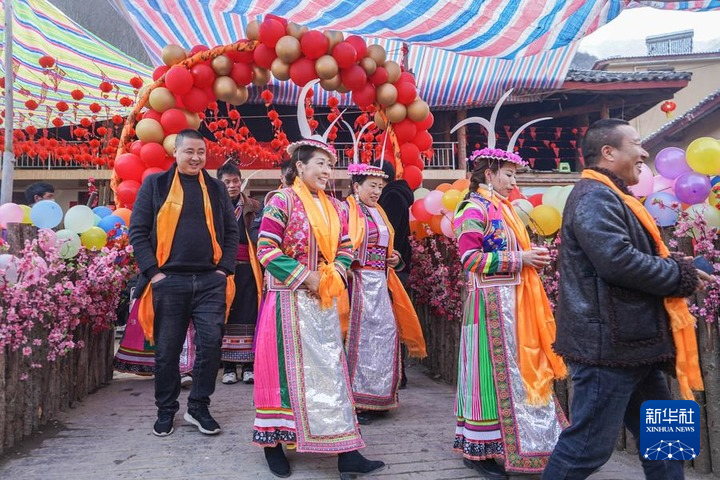 2022年1月13日,在隴南市文縣鐵樓藏族鄉(xiāng)寨科橋村,婚禮宴席結(jié)束后賓客到村寨中走親訪(fǎng)友。新華社記者 郎兵兵 攝