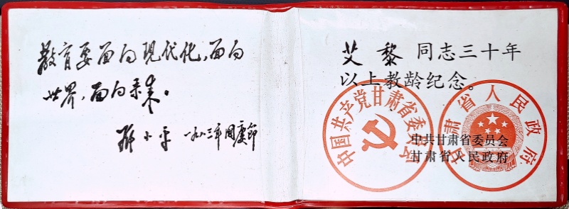 這是一本從教滿三十年的榮譽(yù)證書。由中共甘肅省委、甘肅省人民政府頒發(fā)。證書內(nèi)頁(yè)的左側(cè)是鄧小平1983年國(guó)慶節(jié)題寫的“教育要面向現(xiàn)代化,面向世界,面向未來(lái)”。右側(cè)是“艾黎同志三十年以上教齡紀(jì)念”。“三個(gè)面向”是為北京景山學(xué)校的題詞,是鄧小平提出的教育發(fā)展改革方針,旨在推動(dòng)中國(guó)的教育現(xiàn)代化進(jìn)程,使其更加開放和適應(yīng)未來(lái)發(fā)展的需要,面向世界,吸收國(guó)際先進(jìn)的教育理念和經(jīng)驗(yàn);同時(shí)展望未來(lái),培養(yǎng)適應(yīng)未來(lái)社會(huì)需要的人才。