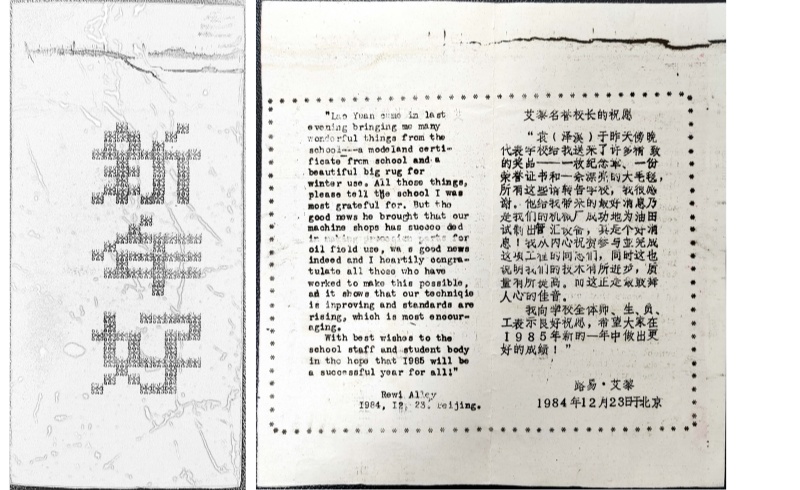 證書是由石油工業(yè)部培黎石油技校申報(bào)的。1984年12月30日,培黎石油技校自制的新年賀卡內(nèi)頁(yè)用中英文印上了名譽(yù)校長(zhǎng)艾黎的祝愿: