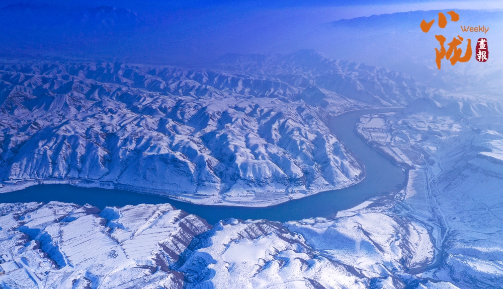 蜿蜒的黃河猶如一條藍(lán)絲帶飄舞在白雪覆蓋的山間、田野,兩岸被雪裝扮得格外壯麗,從空中俯瞰,宛若一幅水墨丹青畫(huà)。