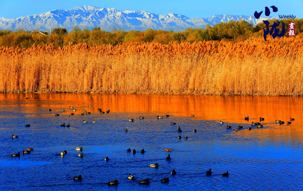 濕地天晴,碧水環(huán)繞,萬畝葦蕩一片金黃,仿佛是一幅富有層次感的油畫,令人陶醉。