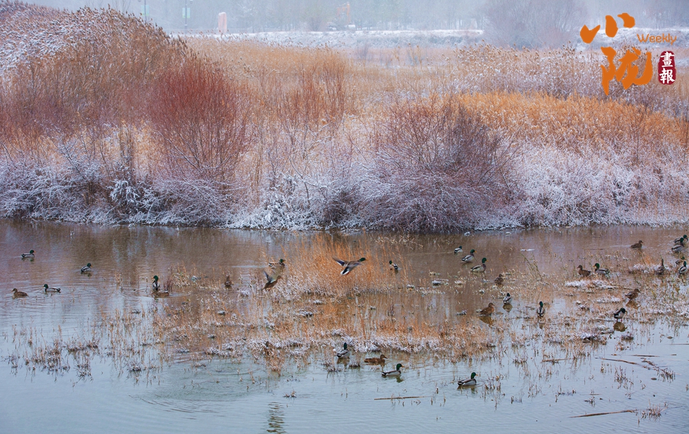 水鳥掠過清澈的湖面,在水中覓食、嬉戲,它們的身影成為雪景中的一抹靈動(dòng)色彩。