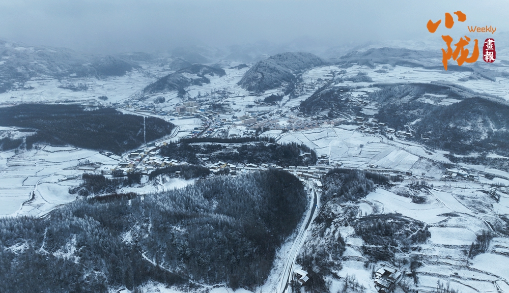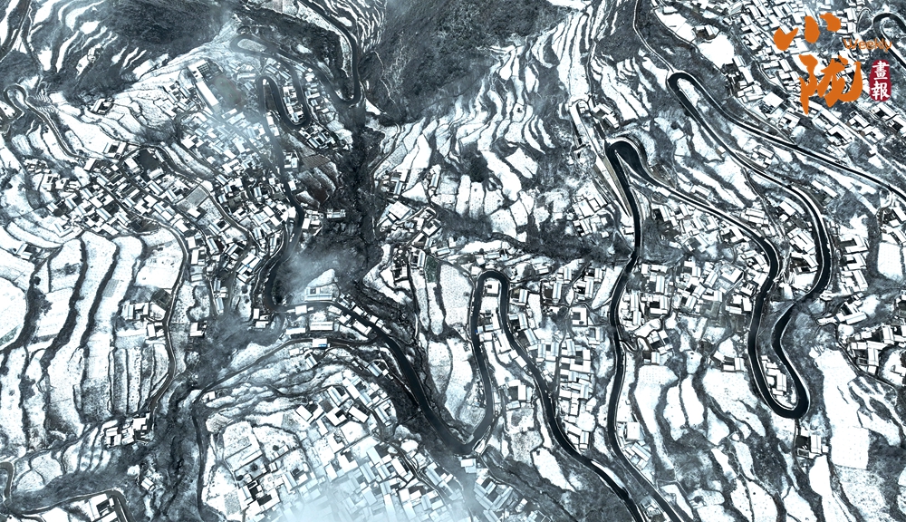 白雪皚皚、粉妝玉砌,群峰環(huán)抱田園山村,如同一幅水墨畫。