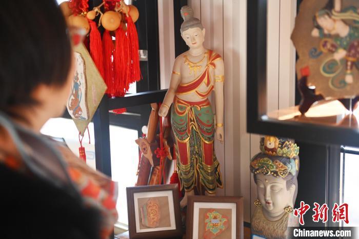 2月8日,甘肅省蘭州市城關(guān)區(qū)“非遺年貨購(gòu)物月”活動(dòng)現(xiàn)場(chǎng),游人挑選敦煌系列文創(chuàng)產(chǎn)品。中新社記者 李亞龍 攝