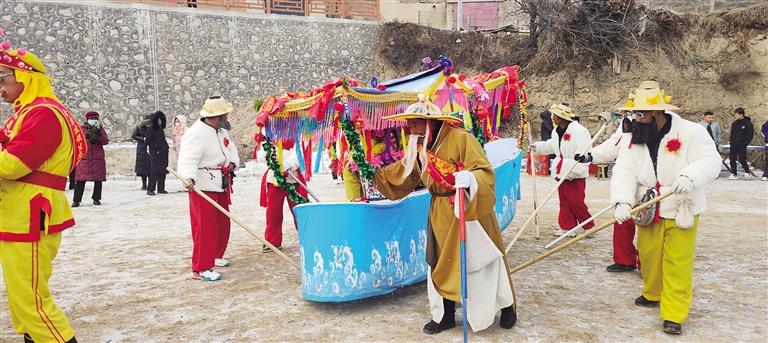 旱般表演時節(jié)奏由慢漸快,闖激流、過險灘,同時,彩扇、華燈秧歌隊協(xié)同表演,并以《十道河》《迎春歌》等伴唱,用三弦、二胡、笛子等伴奏的隴上民間小調烘托氣氛。