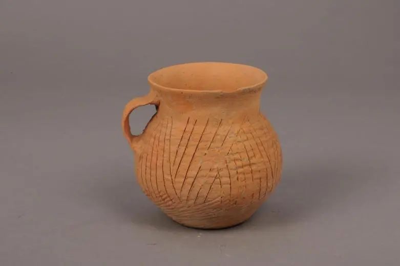籃紋刻劃紋單耳紅陶罐(鎮(zhèn)原縣博物館藏)
