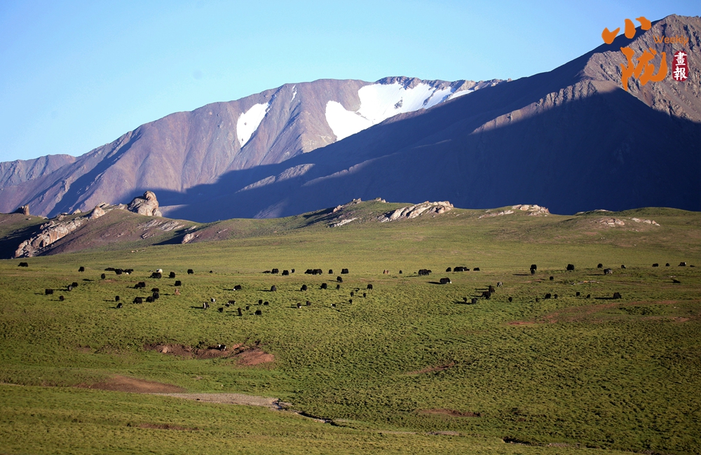 初夏時節(jié),祁連山國家公園張掖肅南縣境內(nèi),天空湛藍如洗,草原碧綠廣闊,巍峨的雪山仿佛插入云端,牛羊在青草中覓食,勾勒出一幅天然秀麗的生態(tài)畫卷。