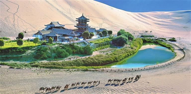 鳴沙山以沙山稱(chēng)奇,多變的沙丘是其更具魅力的體現(xiàn)。在風(fēng)的不斷作用下,使得鳴沙山保持其特有的高度和形式。也正是因?yàn)轱L(fēng)的作用,不同的物質(zhì)在鳴沙山聚集,形成了特有的黑、綠、紅、黃、白五種顏色不同的沙子。而月牙泉就是被鳴沙山包圍,因沙泉相擁千年不涸而聞名于世,坐落在兩個(gè)古老沖積扇之間的月牙泉,由于地下水不斷流出松散沉積層形成泉,逐漸演化成世界地質(zhì)遺跡奇觀。