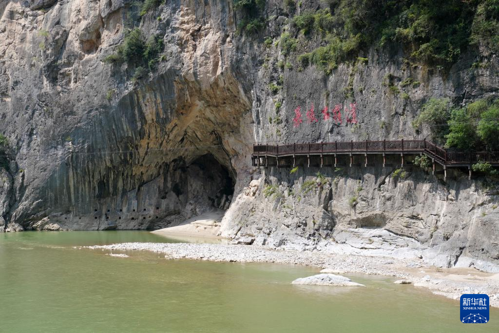 7月15日拍攝的青泥嶺下嘉陵古棧道的棧道孔遺存和復(fù)原的棧道。新華社記者 馬寧 攝