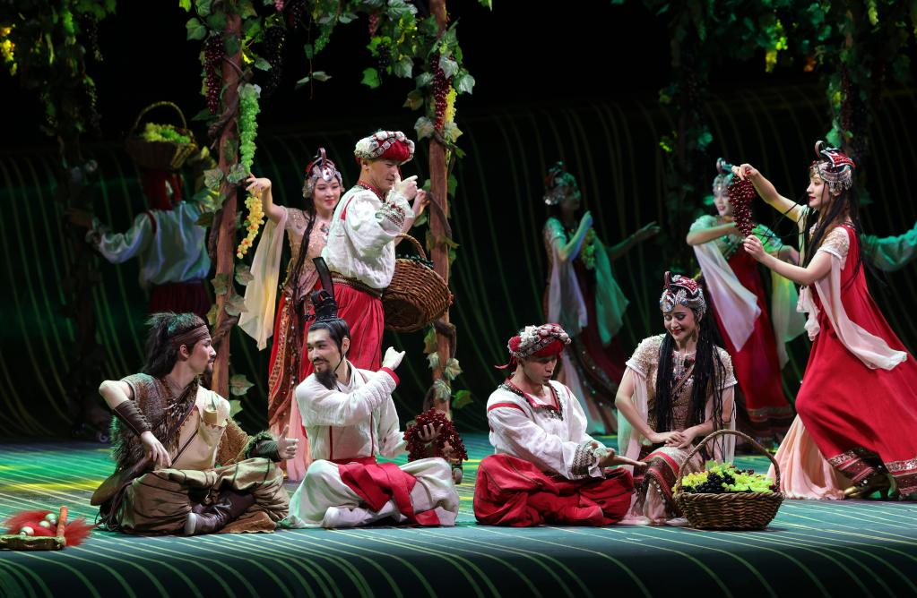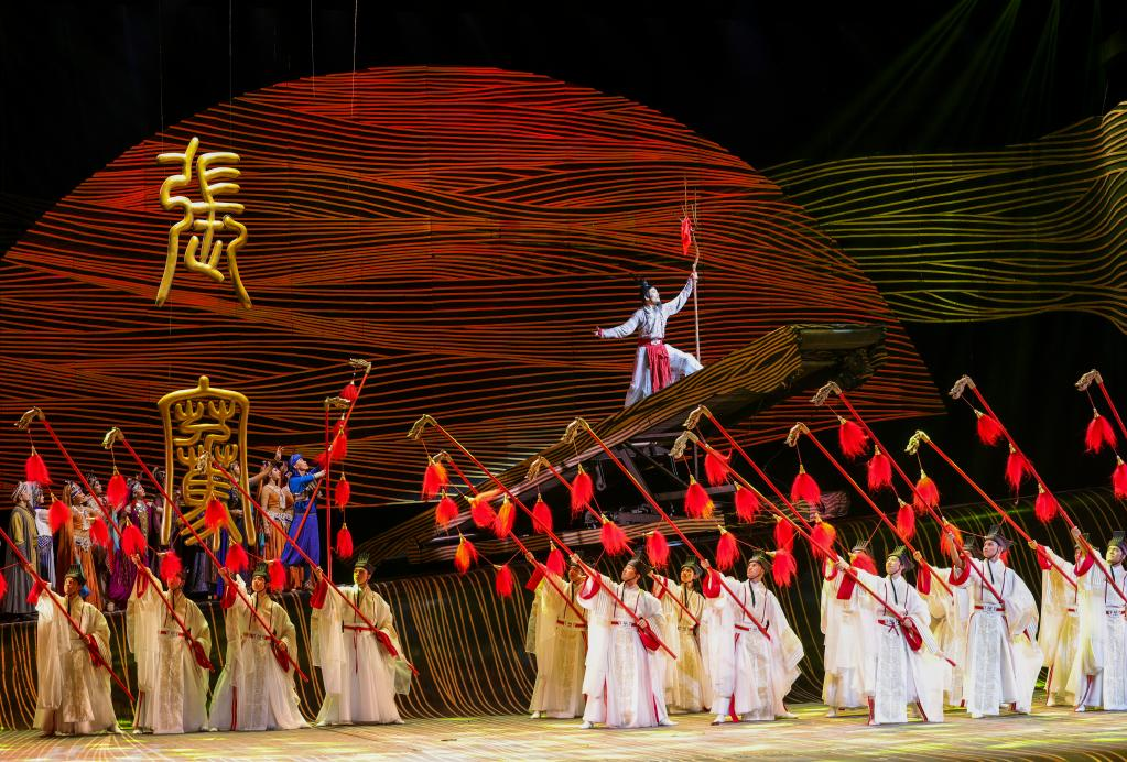 10月27日晚,在烏魯木齊文化中心大劇院,演員在舞劇《張騫》中表演。 10月27日晚,以漢代張騫出使西域?yàn)樗{(lán)本創(chuàng)作的重大歷史題材舞劇《張騫》,在烏魯木齊文化中心大劇院首演。該劇由《授節(jié)》《守節(jié)》《傳節(jié)》《使節(jié)》四幕組成,演繹了張騫出使西域的“鑿空之旅”,展現(xiàn)了各民族廣泛交往、全面交流、深度交融的生動場景。 新華社記者 王菲 攝