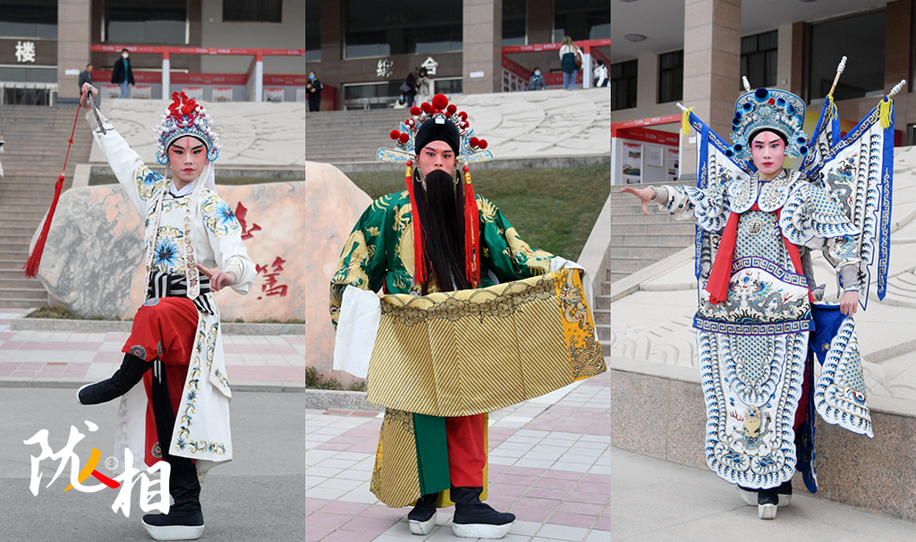 戲曲專(zhuān)業(yè)的學(xué)生戴著金龍同學(xué)制作的盔頭扮演不同的角色(拼版圖片)