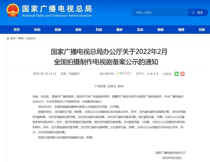 3月15日,國(guó)家廣播電視總局網(wǎng)站刊發(fā)關(guān)于2022年2月全國(guó)拍攝制作電視劇備案公示的通知(以下簡(jiǎn)稱通知)。其中顯示,2022年2月,全國(guó)電視劇拍攝制作備案公示的劇目共33部、1176集。