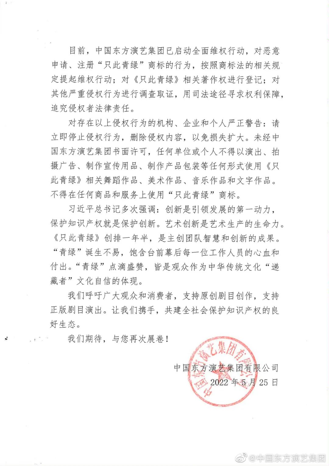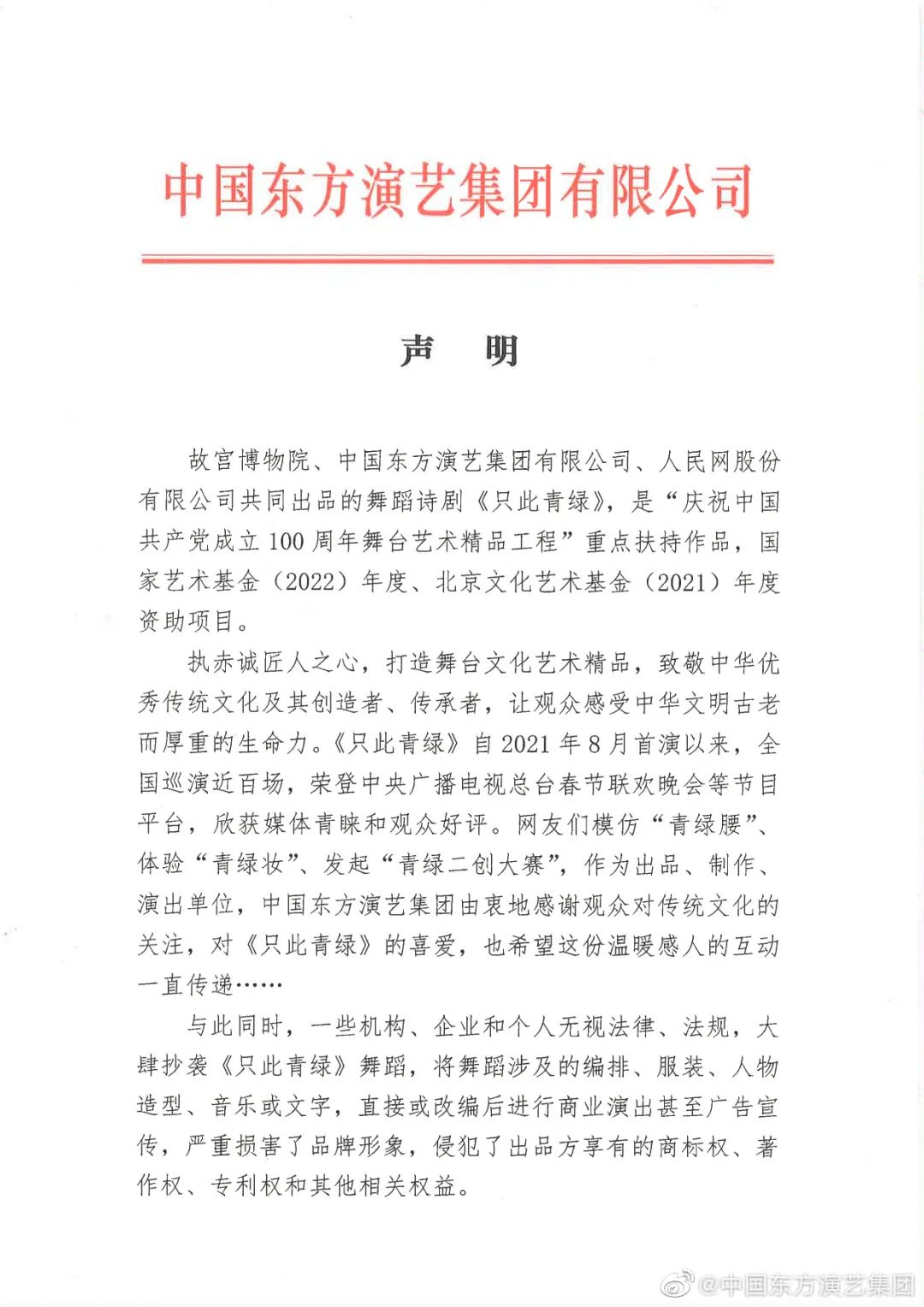 作為舞蹈詩劇《只此青綠》出品方之一,中國東方演藝集團25日發(fā)表聲明,已啟動對《只此青綠》的全面維權行動。
