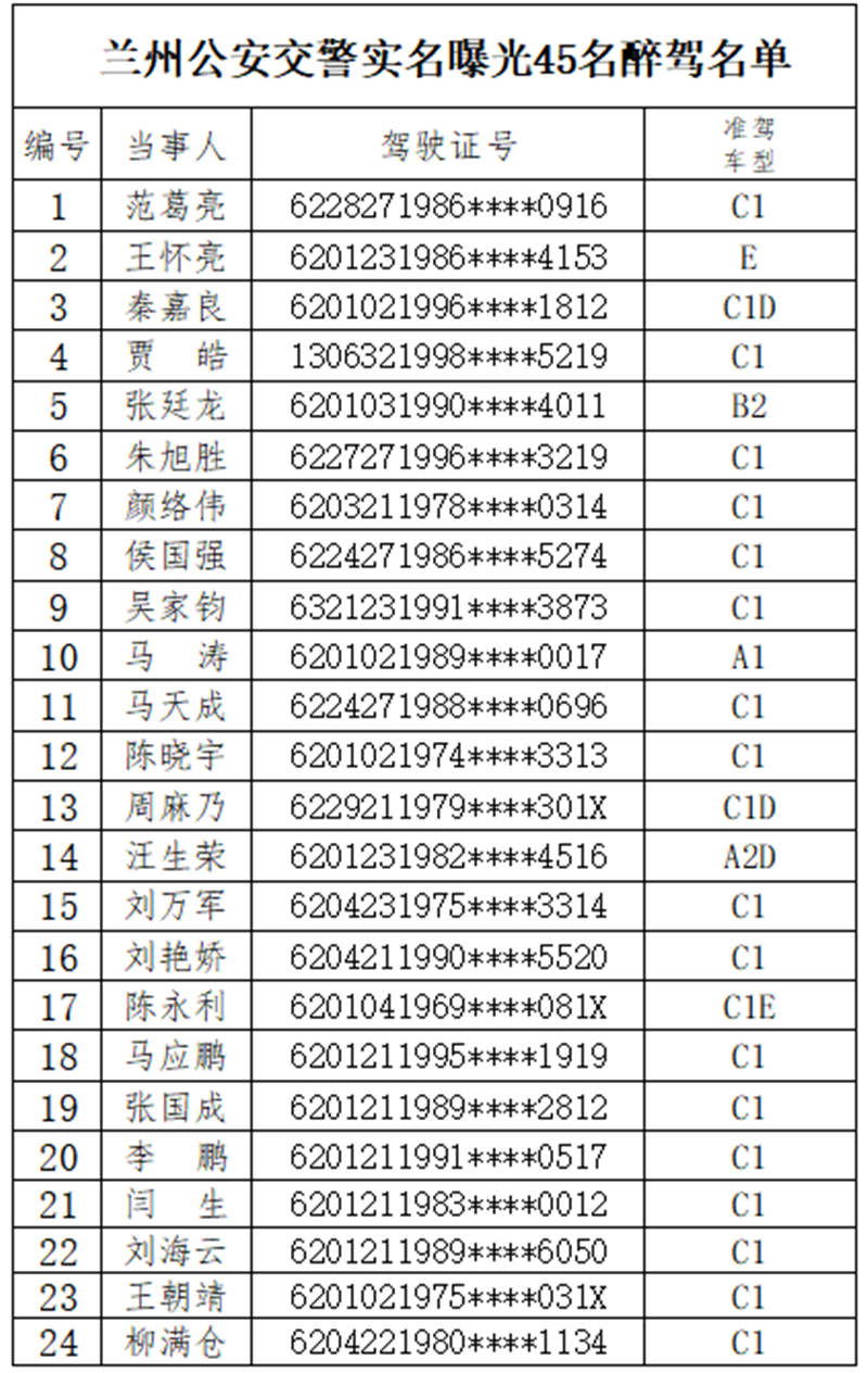 蘭州公安實名曝光45名醉駕人員