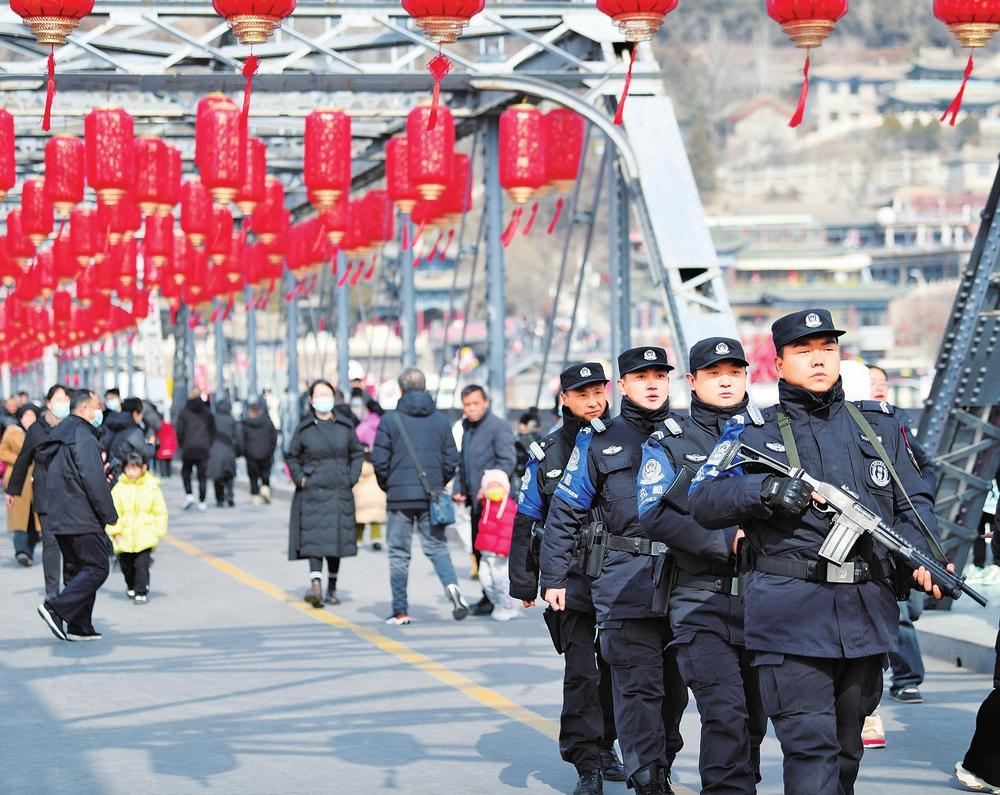 春節(jié)期間,蘭州市公安局城關分局中山橋警務站民警在中山橋巡邏,確保社會治安大局平穩(wěn)有序。新甘肅·甘肅法治報記者王輝攝