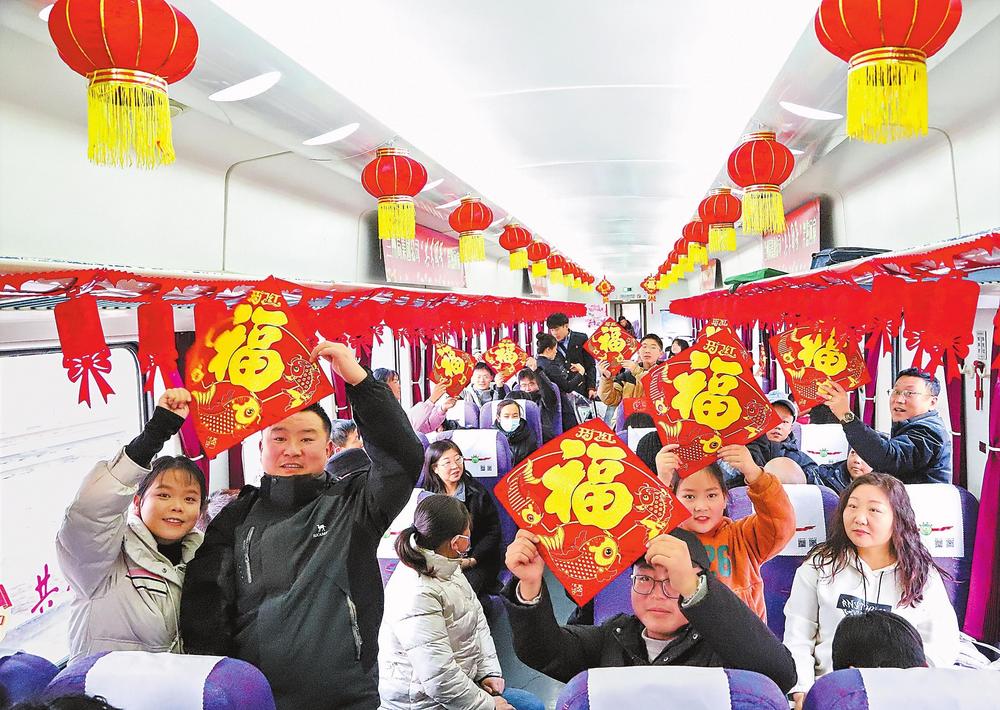7504次“富民號”列車上張燈結彩,歡聲笑語。新春佳節(jié)來臨之際,無數(shù)人心懷著對家鄉(xiāng)的眷戀,踏上溫馨的回家之路。 新甘肅·甘肅日報記者丁凱攝