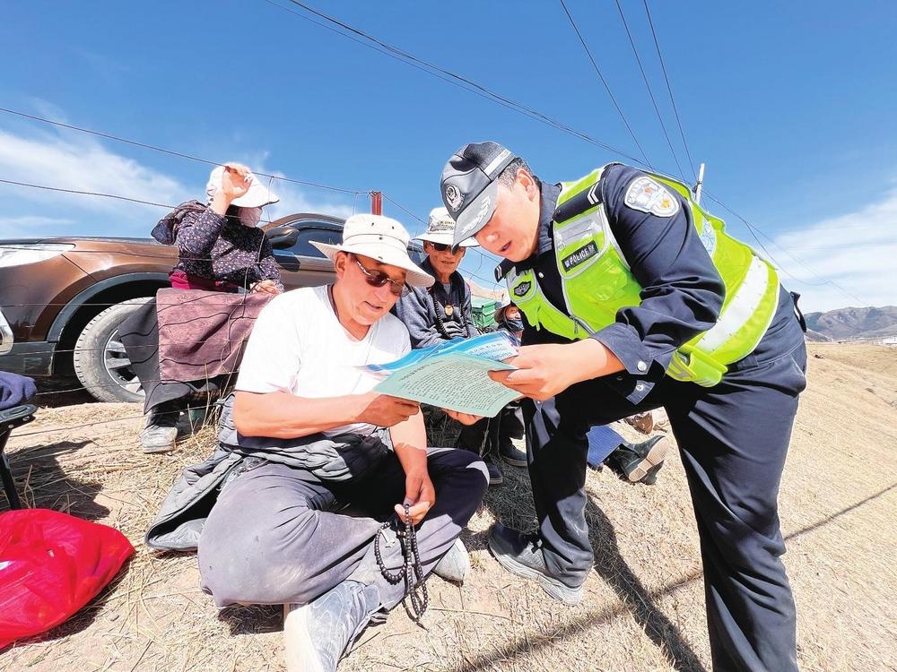 民輔警向群眾講解交通安全知識(shí)。近日,碌曲縣公安局交警大隊(duì)民輔警借助夏澤灘春季賽馬活動(dòng)有利時(shí)機(jī),開展“美麗鄉(xiāng)村行”交通安全巡回宣傳活動(dòng)。 新甘肅·甘肅法治報(bào)記者金凡裕攝