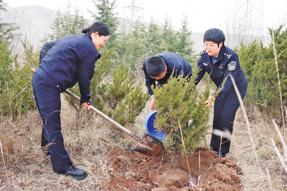 民警植樹現(xiàn)場。近日,隴西縣公安局開展植樹活動,民警手持鐵鍬、鋤頭,分工協(xié)作,挖坑、栽樹、培土、澆水,在指定區(qū)域種下一棵棵樹苗,為大地增添新綠。 新甘肅·甘肅法治報通訊員劉恒杰攝