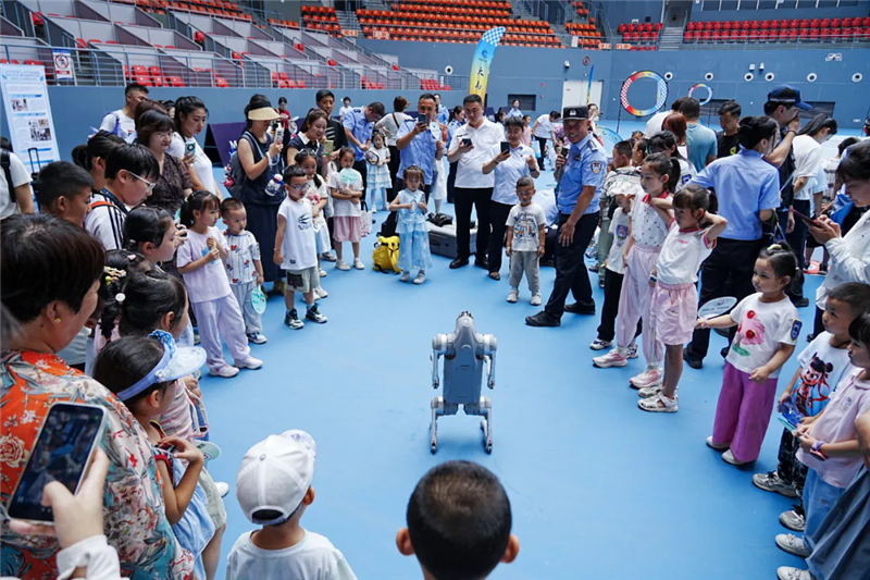 緊接著,在網(wǎng)球館前,大家首先被特警隊(duì)員精彩的防暴小隊(duì)?wèi)?zhàn)術(shù)演練所震撼,矯健的身手贏得了陣陣掌聲。警犬迅猛精準(zhǔn)的撲咬展示更是讓小朋友們連連叫好。警用機(jī)器狗的靈活表演引得大家紛紛上前互動,最讓小朋友們躍躍欲試的還是無人機(jī)穿梭器的體驗(yàn)環(huán)節(jié),戴上眼鏡感受著穿梭器的“速度與激情”,孩子們臉上洋溢著喜悅和興奮,近距離感受到了科技在公安工作中的強(qiáng)大應(yīng)用。
