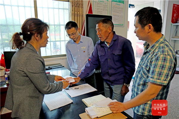 湖南省益陽(yáng)市資陽(yáng)區(qū)長(zhǎng)春鎮(zhèn)幸福村村級(jí)義務(wù)監(jiān)督員主動(dòng)履職,全程參與并監(jiān)督發(fā)放產(chǎn)業(yè)扶貧分紅資金,確保每一筆民生資金落到實(shí)處。(湖南省益陽(yáng)市資陽(yáng)區(qū)紀(jì)委監(jiān)委 張偉敏 攝)