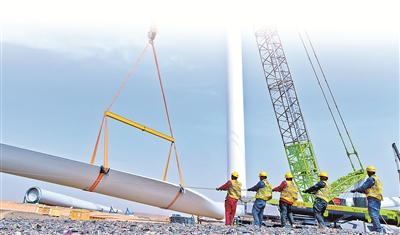 甘肅省高臺(tái)縣境內(nèi)有戈壁荒漠2000多平方公里,近年來(lái)憑借風(fēng)光資源優(yōu)勢(shì),發(fā)力新能源產(chǎn)業(yè)賽道。圖為該縣某新能源風(fēng)力發(fā)電項(xiàng)目建設(shè)現(xiàn)場(chǎng),工作人員正在安裝風(fēng)力發(fā)電機(jī)。新華社發(fā)