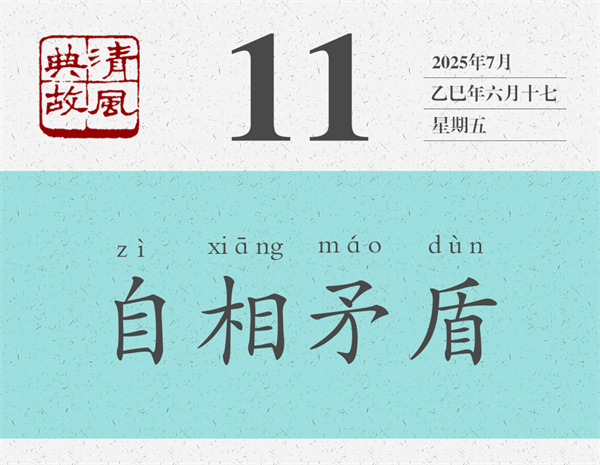“自相矛盾”的本義是,不管是自己的矛刺穿了自己的盾,還是自己的盾無法被自己的矛刺穿,都會(huì)陷入不能自圓其說的難堪境地。后人則以“自相矛盾”為典,比喻一個(gè)人前面說的和后面說的、前面做的和后面做的相互抵觸,或者自己所說與所做、自己所為與所述互相沖突。也指同一機(jī)關(guān)、同一機(jī)構(gòu)中各個(gè)部門、各個(gè)成員之間說法不統(tǒng)一,行為不一致。宋人王觀國(guó)《學(xué)林·言行》:“圣賢言行,要當(dāng)顧踐,毋使自相矛盾。”