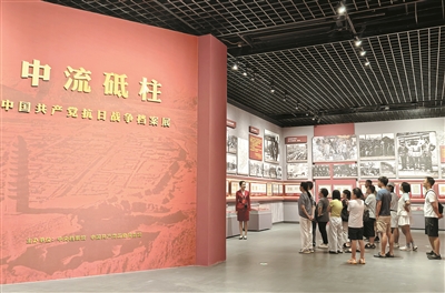走進中國共產(chǎn)黨歷史展覽館四層專題展廳,首先看到一面紅底金字的大型展板,形似一本翻開的書本。“書”的正面,“中流砥柱”四個大字在燈光照射下閃閃發(fā)亮,下方緊跟一行小字“中國共產(chǎn)黨抗日戰(zhàn)爭檔案展”;側(cè)面,金色字體展示著毛澤東同志《中國共產(chǎn)黨在民族戰(zhàn)爭中的地位》里的內(nèi)容:“每一個共產(chǎn)黨員必須發(fā)揮其全部的積極性,英勇堅決地走上民族解放戰(zhàn)爭的戰(zhàn)場,拿槍口瞄準(zhǔn)日本侵略者。”