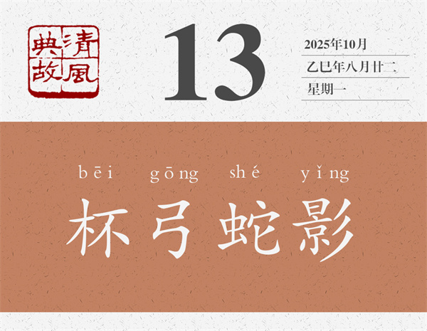 樂(lè)廣想,哪有這回事呢?當(dāng)時(shí),河南聽(tīng)事堂墻壁上掛著一張弓,上面用漆畫著一條蛇。樂(lè)廣就想,這位朋友所見(jiàn)杯中之蛇,是不是這張弓的影子呢?于是,復(fù)原了上次喝酒的現(xiàn)場(chǎng),讓客人坐在原來(lái)的位置上,將酒杯放在原來(lái)的地方上,問(wèn)他“酒中復(fù)有所見(jiàn)不”,客人說(shuō)“所見(jiàn)如初”。樂(lè)廣這才告訴他,杯中之蛇只是角弓之影而已。客人于是“豁然意解,沉疴頓愈”。后世即以“杯弓蛇影”為典,比喻疑神疑鬼,自相驚擾。明人袁宏道詩(shī)《病中和黃道元至日禪寺夢(mèng)悉詩(shī)》:“消愁莫問(wèn)弓蛇影,對(duì)境聊觀夢(mèng)幻身。”