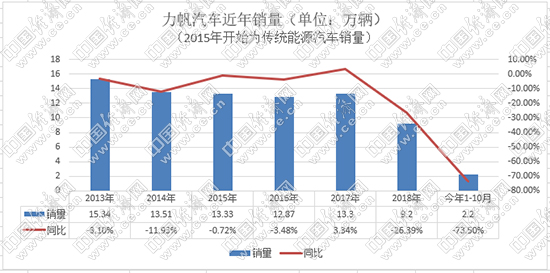 2006年,力帆推出首款轎車(chē)力帆520,新車(chē)不足5萬(wàn)元的售價(jià)在當(dāng)時(shí)引發(fā)關(guān)注,月銷(xiāo)量一度達(dá)到5000輛。2013年,力帆年銷(xiāo)售汽車(chē)15.34萬(wàn)輛,成為汽車(chē)界的一匹黑馬。然而,好景不長(zhǎng)。自2016年開(kāi)始,力帆汽車(chē)進(jìn)入下行趨勢(shì),目前更是步履維艱。力帆產(chǎn)銷(xiāo)快報(bào)顯示,2019年1-10月,力帆傳統(tǒng)乘用車(chē)?yán)塾?jì)銷(xiāo)售2.2萬(wàn)輛,同比下滑73.5%,10月僅銷(xiāo)售29輛;新能源累計(jì)銷(xiāo)售2458輛,同比下降65.42%,10月僅銷(xiāo)售423輛。